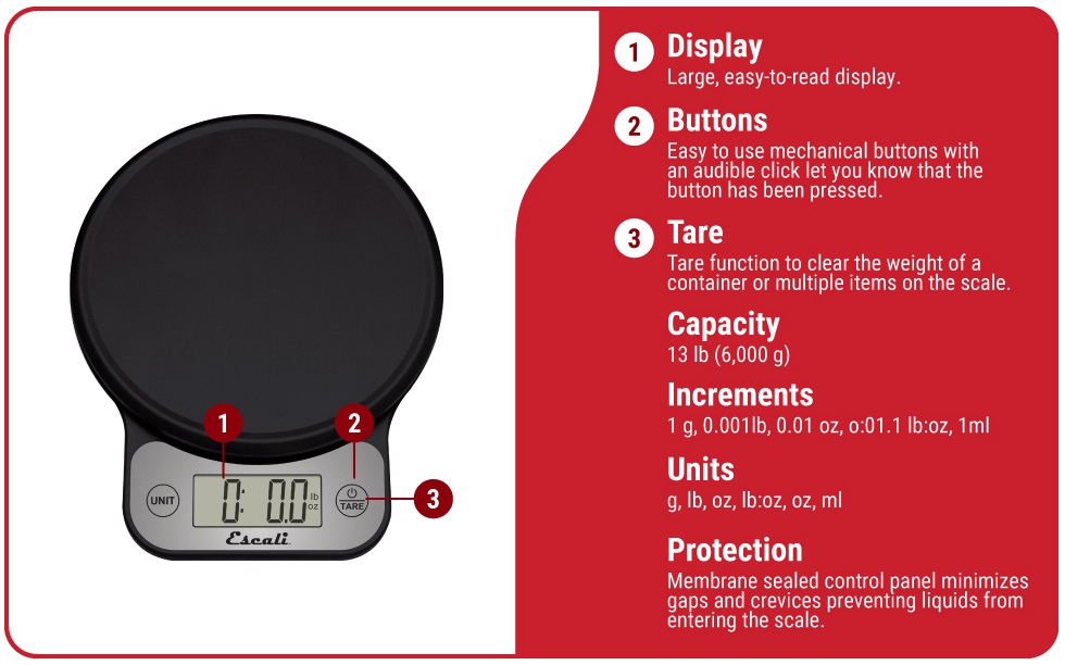 Get quick food measurements with the Escali Blue Telero Digital Kitchen Scale. It has numerous features that make it simple to use. This includes a large, easy-to-read display and a sealed control panel that lets you weigh both liquid and dry ingredients. Simply push the button to turn it on and choose the unit of measurement (grams, ounces or pounds). This digital scale can also weigh in increments.