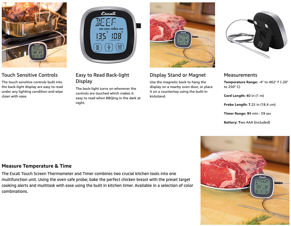 The Escali Touch Screen Thermometer & Timer (DHR1B) combines convenience, accuracy, and modern design to help you achieve perfectly cooked results every time.
