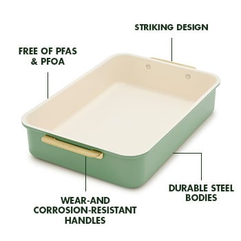 Our Reserve Rectangular Pan combines durability and style for all your baking needs. Perfect for roasting veggies, baking casseroles and more – the aluminized steel ensures even heat distribution, while our PFAS-free nonstick guarantees easy food release and healthier meals.