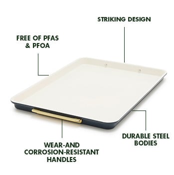 Perfect for cookies, sheet cakes, or roasted veggies, this pan features heavy-gauge aluminized steel for even heat distribution and daily durability. Our PFAS-free nonstick provides effortless food release, while the gold-tone handles offer a strong and stylish touch.