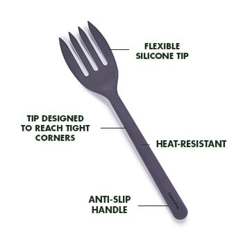 This fork’s endlessly versatile 10-in-1 design means you can stir, mix, blend, mash, scrape, whisk, lift, scoop, shred, and flip! This multipurpose fork is crafted from heat-resistant silicone, so it’s perfect for use alongside ceramic nonstick pans.