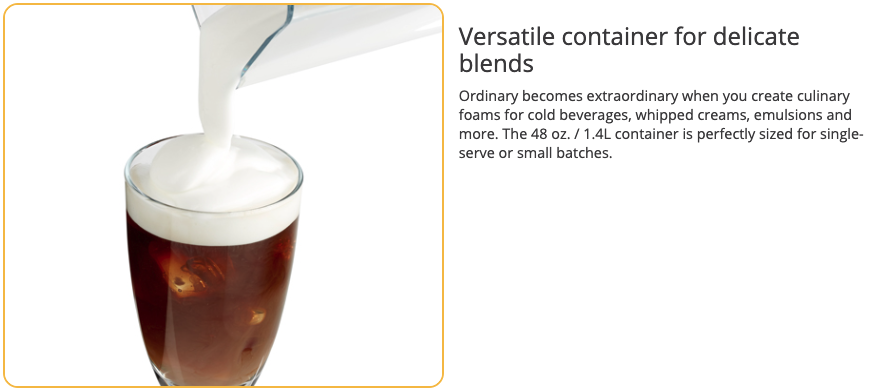 Expand the skill set of your Hamilton Beach Commercial high-performance blender with the AirWhip Frothing Jar. The unique, patent-pending agitator means that you can whip, froth, aerate and emulsify without moving to a separate piece of equipment.