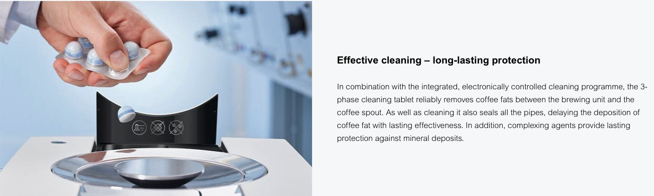 In the second phase, the care phase, special active ingredients form a protective barrier on the surfaces of the components, preventing coffee residue and fats from building up.