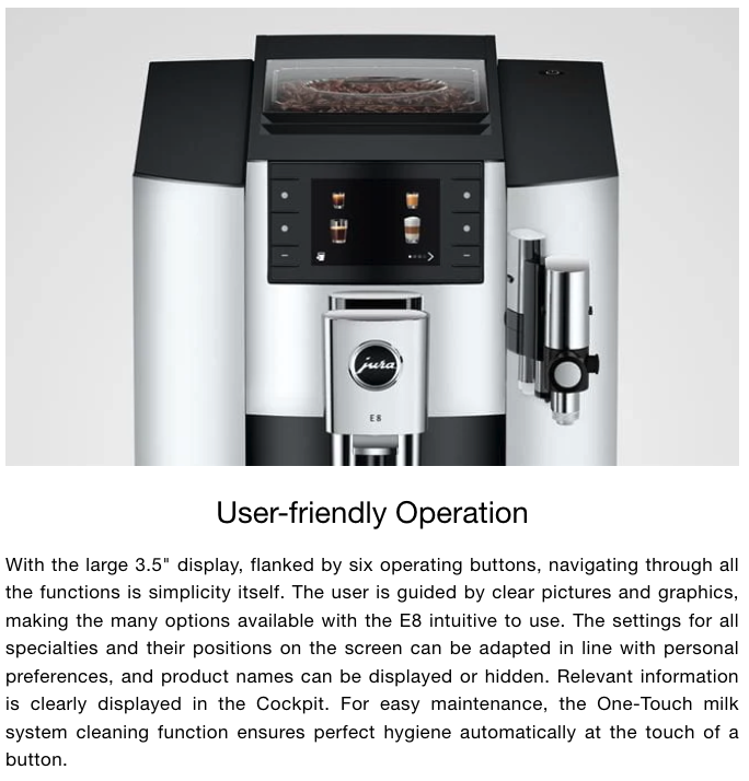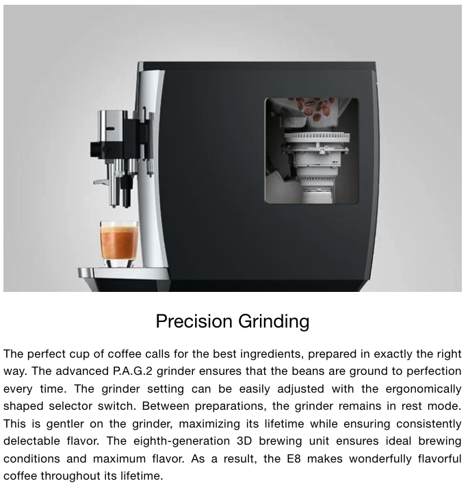 Thanks to the P.A.G.2 grinder, the beans are always freshly ground, while the advanced brewing technology ensures that the coffee is extracted under optimum conditions. Choosing your coffee is direct and intuitive, because the 3.5" push-button display with large symbols is very easy to use. Equipped with a range of premium-segment features, the E8 also retains its value over time.