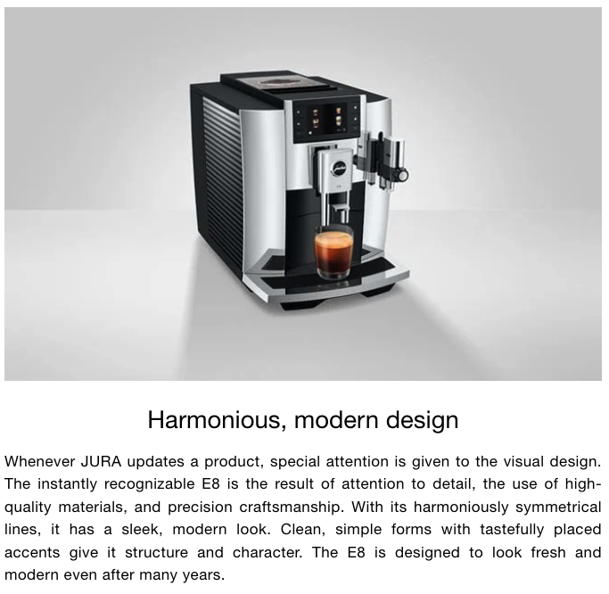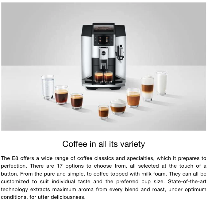 The latest generation of the E8 lives up in every way to the high expectations that await the new edition of JURA's most successful coffee machine model. Incredibly simple to use, it combines delicious coffee results with sleek modern design.