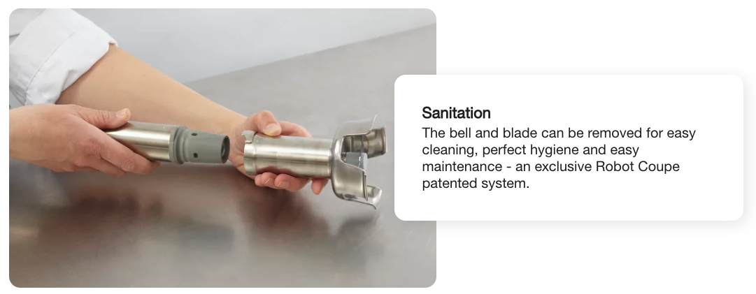 The stainless steel bell and blade assembly easily disassemble for cleaning, while gears are housed in an all metal gear box for longevity. For comfort, an ergonomic handle reduces fatigue during use, while a locking button enables continuous operation during large jobs. The Robot Coupe MP350 VV requires a 120V electrical connection for operation.