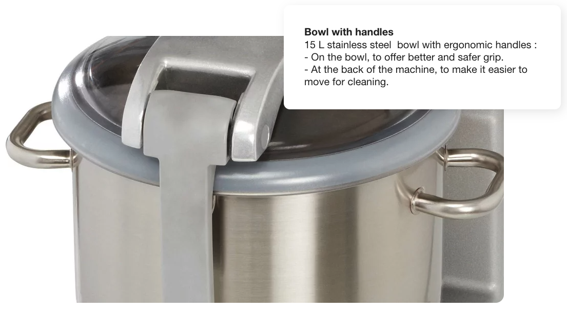 This sturdy machine features a 15 L brushed stainless steel cutter bowl with handle and a leak proof, see-through lid that enables you to securely process food while keeping an eye on the progress. This versatile unit boasts two speeds at 1800 and 3600 RPM, and is able to liquefy, chop, grind, puree, and emulsify - making it perfect for use in your commercial kitchen or healthcare facility!
