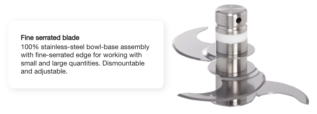 This machine's powerful 4.5 HP, three phase motor is operated by power buttons and a speed selector, and all food processing components may be disassembled for easy cleaning. The included adjustable, stainless steel smooth edge 3 blade assembly quickly processes an array of foods, while the included bowl scraper assembly ensures that every bit is processed and used!