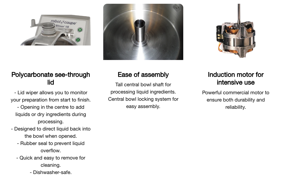 The Robot Coupe Blixer 15 requires a 208/240V, 3 phase electrical connection for operation. For safety, a motor brake and magnetic safety system are built into the unit.