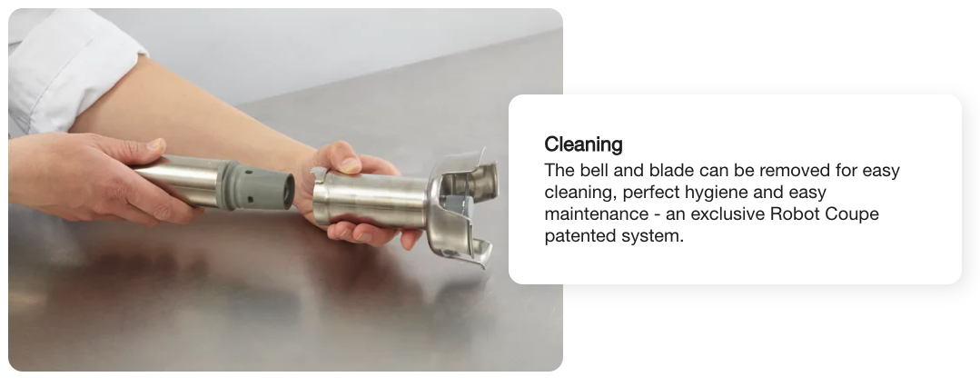 Its compact, ergonomic design features a removable stainless steel bell and blade for easy cleaning. A stainless steel wall support gives added stability and control while blending, and the included blade disassembly tool offers added convenience when finished with the unit. The Robot Coupe CMP 250 VV compact requires a 120V electrical connection for operation.