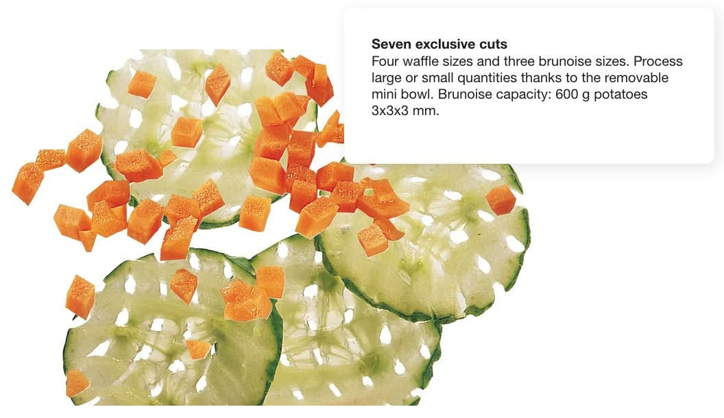 | Discs | Brunoise Disc 3x3x3 mm (1/8"x1/8"x1/8"), Waffle Disc 3 mm (1/8") |
