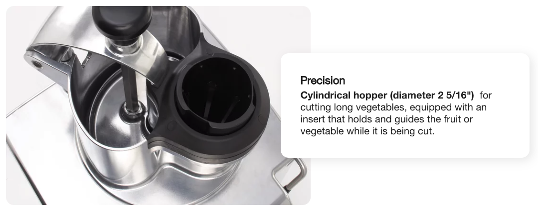 A continuous feed chute means you can process large amounts of produce directly into a separate container, eliminating the need to stop and empty a batch bowl. The large 6-11/16" full moon hopper gives you the space you need to process bulky ingredients like a head of lettuce or cabbage, while the smaller 2.25" cylindrical hopper makes it easy to process long, narrow produce like zucchini and carrots.