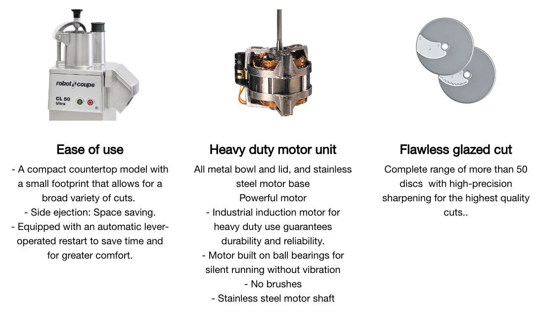 The CL 50 Ultra is easy to operate thanks to its simple on / off controls. This unit will become the workhorse of your kitchen, allowing anyone to produce large quantities of ingredients in very little time.