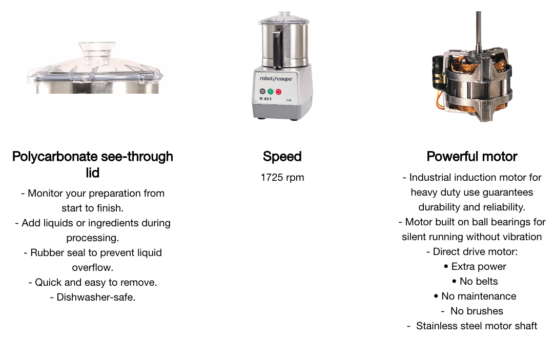 Manually prepping ingredients takes a lot of time and poses a safety risk, exposing your employees to sharp knives that can easily cause injury. Robot Coupe's R401B batch bowl food processor eliminates both problems by giving you near-limitless prep options, and by doing that prep work in a fraction of the time it takes to do manually. Use the batch bowl to puree, chop, mix, and a variety of other tasks!
