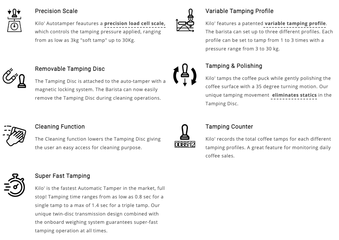 Kilo’ is an Automatic coffee Tamper designed for busy coffee shops where speed, efficiency and consistency are required. Slingshot's goal is to “deliver a perfect level tamp for every shot, regardless of the barista on duty". The downward tamping force ranges from a light 3 Kg to a heavy 30 Kg, and users can program the machine to tamp a single coffee bed up to three times, each at a different pressure. Baristas may choose different numbers and pressures of compressions for different origins prepared in different doses and grind settings.