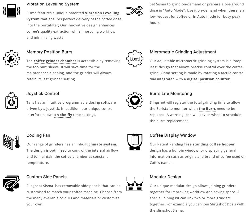 Sisma is a new generation of on-demand grinders designed for busy cafes requiring quality coffee extraction and efficient workflow. Sisma features a patented Vibration Levelling System that ensures perfect delivery of the coffee dose into the portafilter.