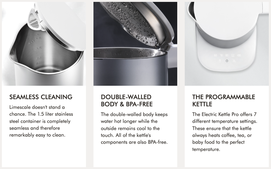 The ZWILLING Kettle Pro features 6 pre-set program settings on the 360° docking base so you can choose your temperature with just one touch, making it perfect for brewing coffee, different varieties of tea, and warming baby bottles.