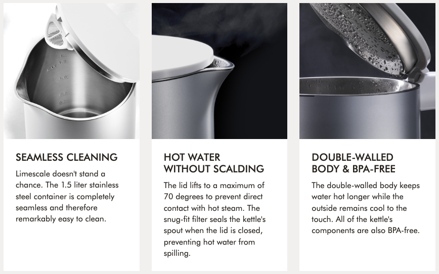 The seamless, 1.5L stainless steel container with concealed heating elements makes this kettle both durable and hygienic. It is extremely easy to clean and the build in limescale filter - also partially made with stainless steel - ensures better flavour. The snug-fit filter also seals the spout when the lid is closed, thereby keeping spillage to an absolute minimum even when the kettle is accidentally knocked. The lid opens to a maximum of 70 degrees to prevent direct contact with hot steam. An additional safety feature is the built-in dry boil and overheating protection that automatically switches off the kettle to prevent damage to the heating element.