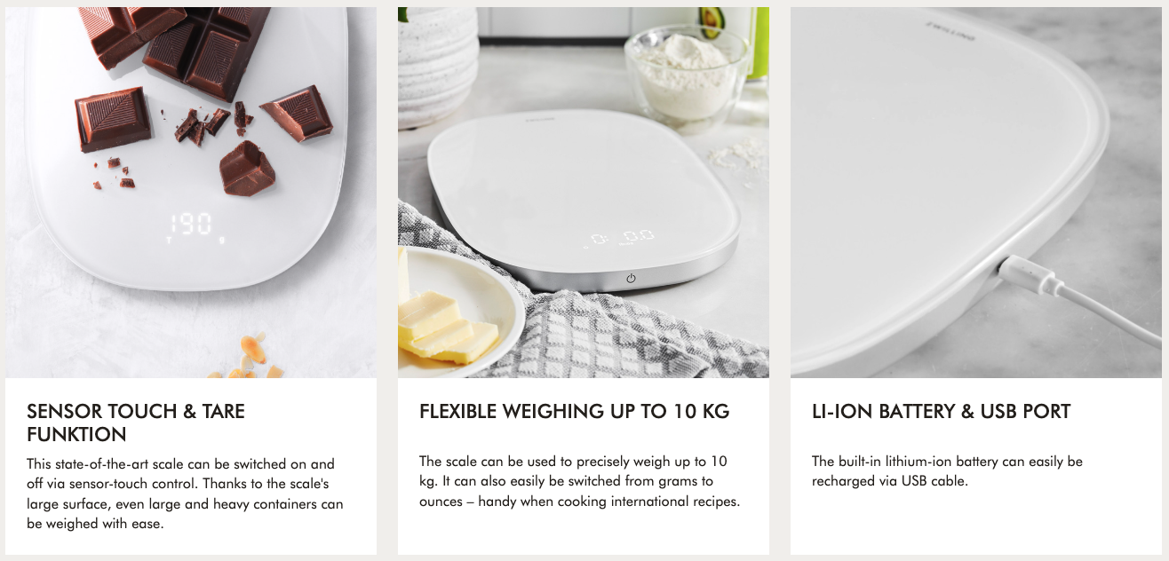 ZWILLING and scales are a match made in heaven. The new digital kitchen scales with battery combine a pure, modern design with absolute precision. The rechargeable Li-ion battery is built into the white housing to do away with the need for buying new batteries.
