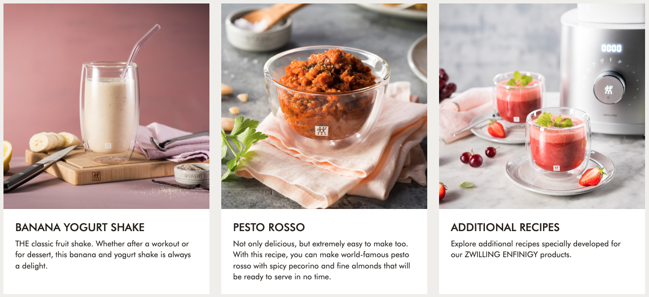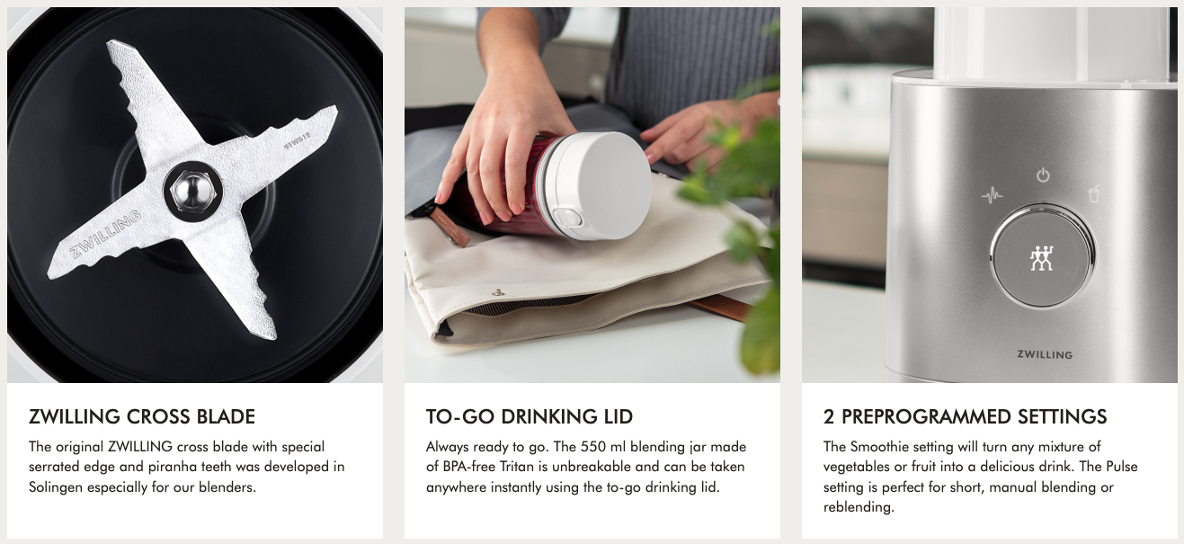 Like all Enfinigy products, the Personal Blender offers a free downloadable app. The ZWILLING Culinary World App QR code on the product packaging fires up the app so you can search a database of original recipes.