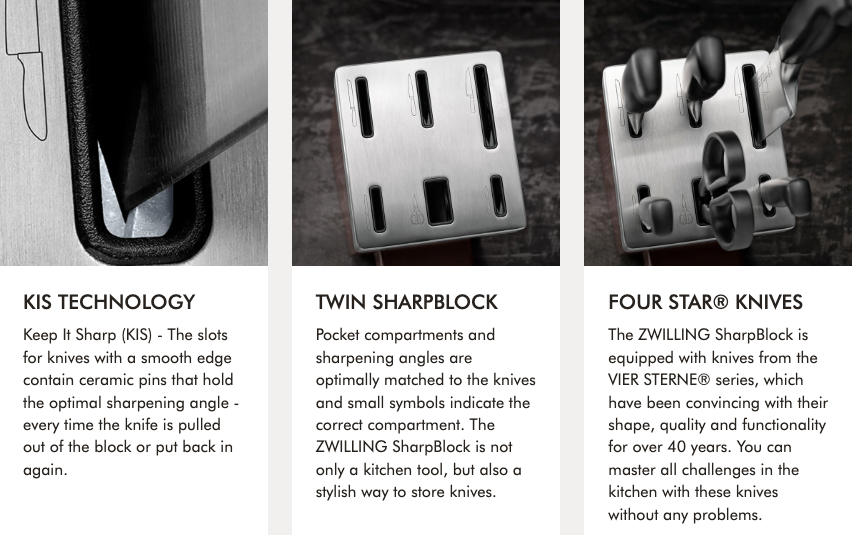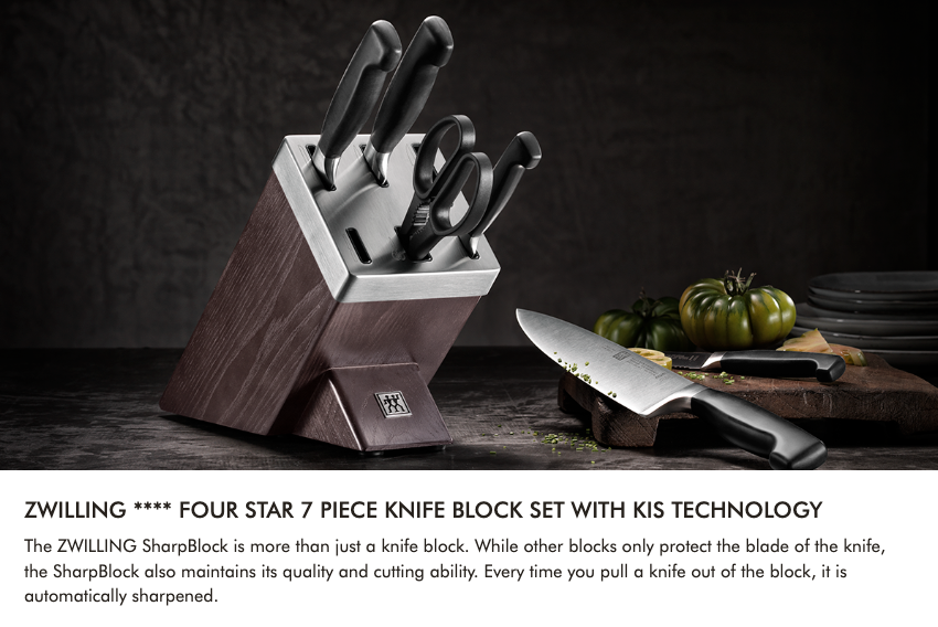 The ZWILLING SharpBlock with KIS Technology from the FOUR STAR series guarantees optimal sharpness and effortless maintenance for your knives. Designed to protect against damage and eliminate the need for manual sharpening, this self-sharpening knife block set keeps your blades in peak condition.
