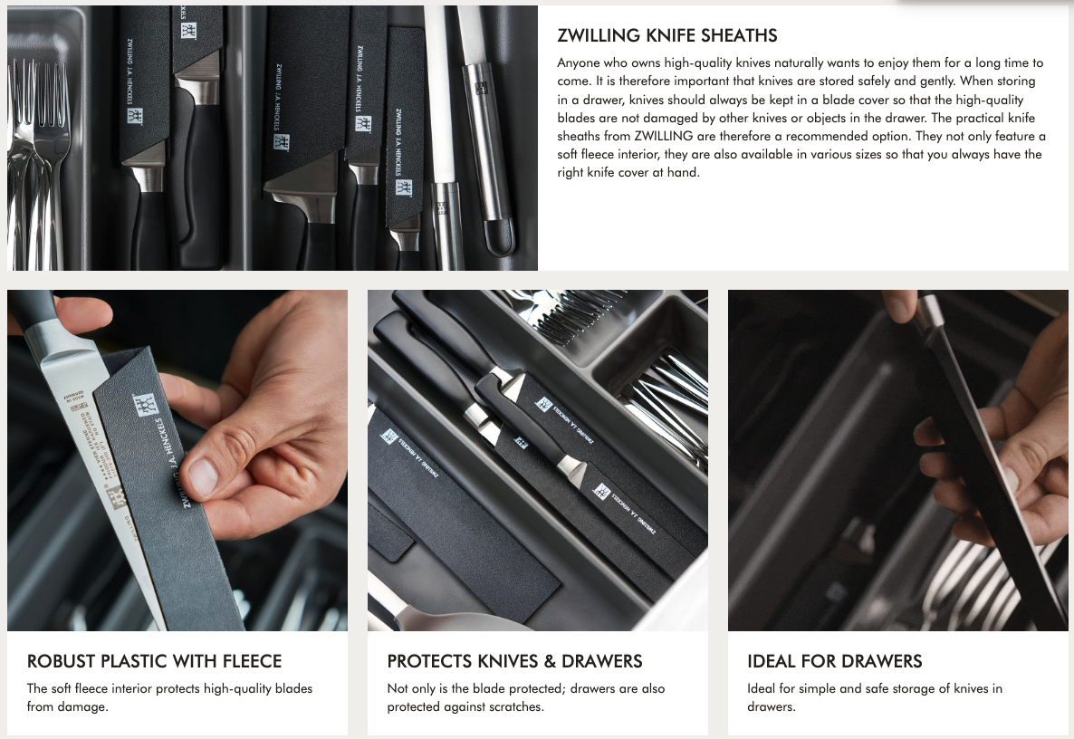 With this knife sheath from ZWILLING, you can securely store away your sharp knives while protecting hands, blades and drawers. The plastic cover is lined with a soft fleece interior enveloping the blade to protect it against dirt and to help retain its sharp edge. Suitable for storing knives with blades of up to 26 cm long.