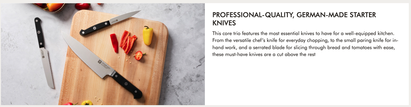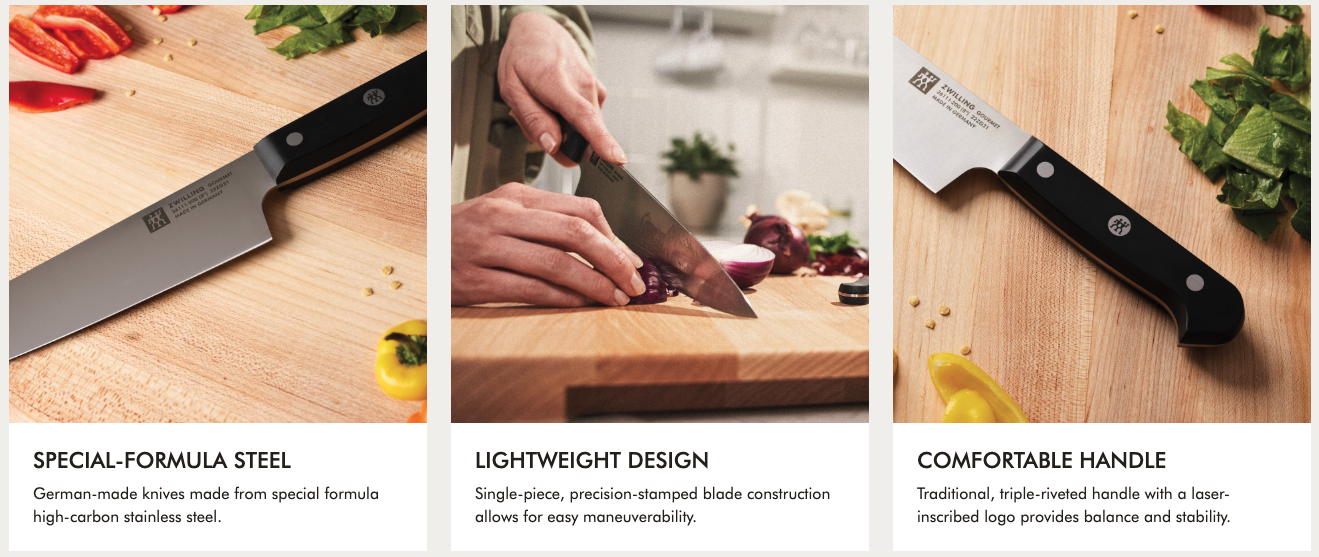 ZWILLING Gourmet is the go-to knife for home Chef's eager for their everyday knife to be exceptional. The single-piece, precision-stamped blade construction is lighter than forged knives, allowing for maximum maneuverability. Proudly crafted in Germany, the knives are made of special-formula steel that has been perfected for over 285 years. Combined with ZWILLING's signature ice-hardening technique, the blades are harder, sharper, they will not stain or chip and they retain their sharpness longer. The ergonomic, triple-riveted handle ensures fatigue-free cutting. Experience the comfort, durability, and sharpness of ZWILLING Gourmet.
