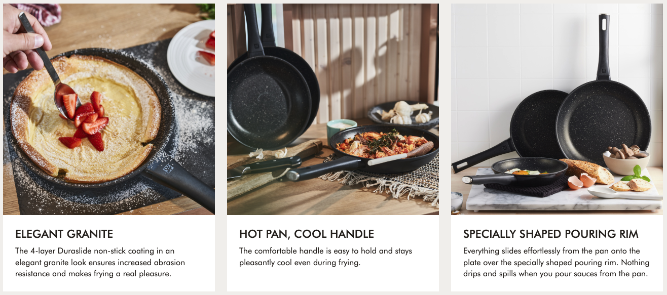 Prepare eggs, pancakes, paella and stir fries with this 2 pack frying pan set from the ZWILLING. The special design by Studio Thun from Italy makes this frying pan a visual delight. The Duraslide Granite non-stick coating offers 100% improved wear resistance compared with conventional non-stick coatings. The pan's solid forged aluminium core ensures even heat distribution.