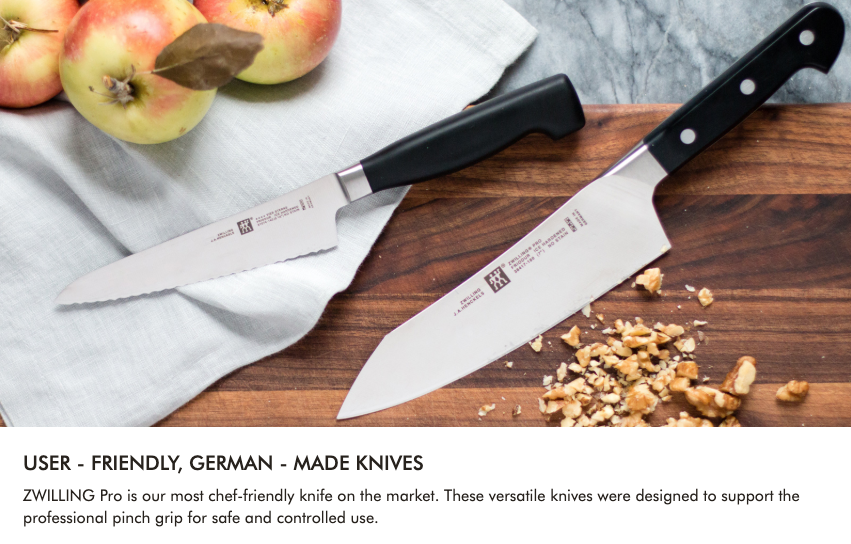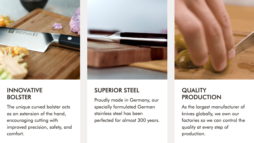 ZWILLING Pro boasts a unique curved bolster that acts as an extension of the hand, supporting the professional pinch grip, with thumb and index finger on the blade, for safe cutting and less fatigue. The blade was designed with a broad curve in the front to facilitate the rocking motion of Western cutting, while the straight back is ideal for the chopping motion Japanese knives were designed for. The full length of the blade can be used when cutting and can be sharpened from bolster to tip.