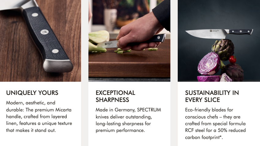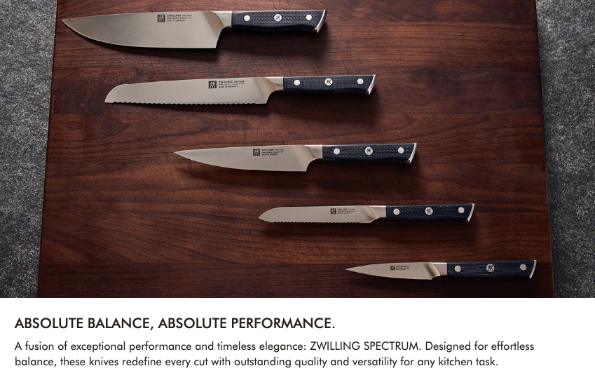 Meet ZWILLING Spectrum—our sharpest, most advanced knives yet! Crafted with a razor-sharp 25° edge, these exceptional, German-made blades are sharper than ever. Designed for maximum performance, The Spectrum collection is detailed with a stainless-steel endcap that adds balance while making a striking statement. The endcap delivers a comfortable grip, enhances balance—and feels good in the hand.