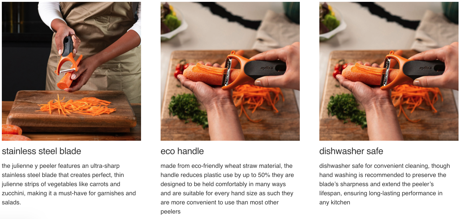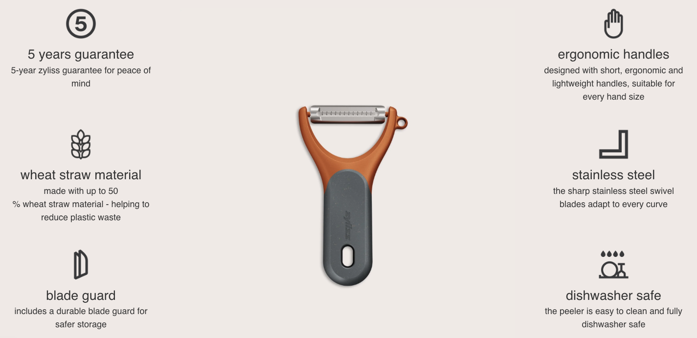 Elevate your kitchen game with the Zyliss Julienne Y Peeler, expertly designed to create perfect julienne strips from vegetables like carrots. Crafted with an eco-friendly wheat straw handle, this peeler reduces need for virgin plastic by up to 50% while offering a comfortable, ergonomic grip. The serrated swivel blade delivers precise, uniform strips effortlessly, and the side eye cutter removes imperfections with ease. Dishwasher-safe and with a durable blade guard, it's the perfect addition to any kitchen. Backed by a 5-year guarantee, this peeler seamlessly combines sustainability and performance for a smarter, greener kitchen.