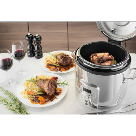 High pressure forces liquid into foods quickly. This allows for quicker cooking and moister food. Tougher meats are turned tender with a pressure cooker. With modern advancements, pressure cookers act as slow cookers as well. One of our favorite go-to pressure cookers is the T-Fal Electric Pressure Cooker/ Multi-Cooker. With 6-quart capacity, and 25 different cooking programs, this pressure cooker is more than a basic appliance for your kitchen. It will set you up for culinary success!